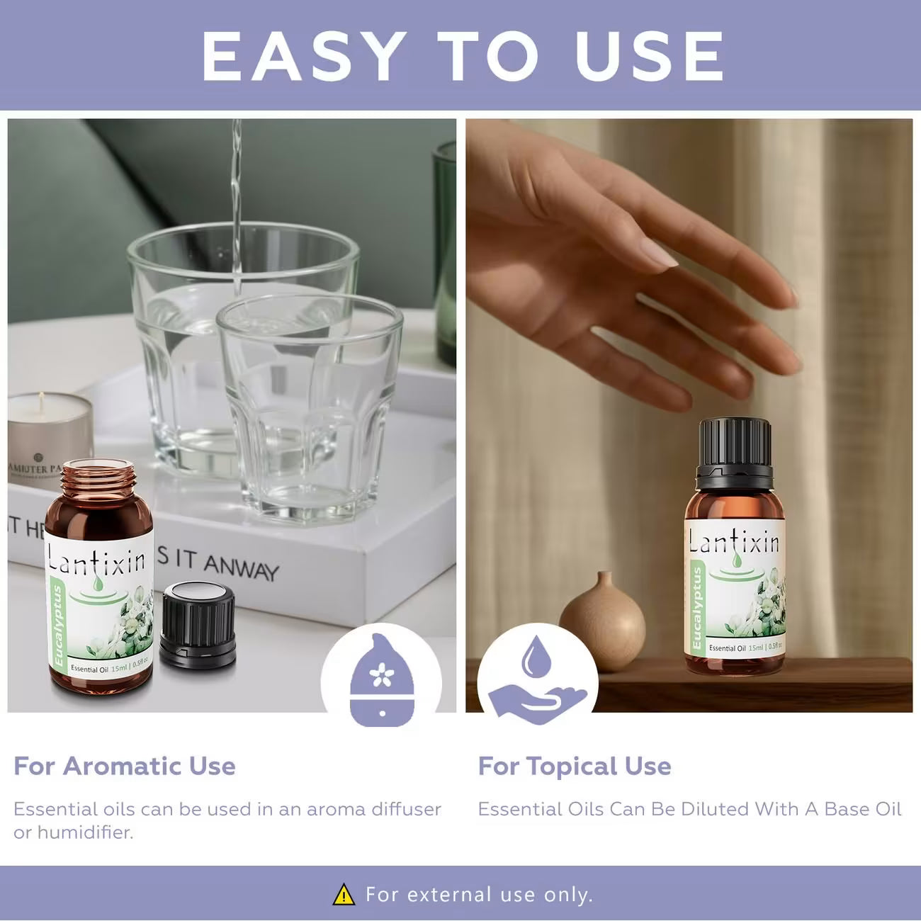 Bring clean, refreshing eucalyptus fragrance into your space with Lantixin’s pure essential oil. Perfect for diffusers, it creates an invigorating atmosphere that enhances focus, clears the mind, and refreshes your environment.